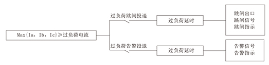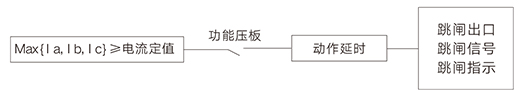 当三相电流中任意一相电流超过整定值并达到相应整定延时后保护动作(可动作于告警或者跳闸),并记录相应的事件信息。相应保护逻辑如 下图所示。