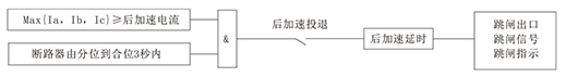 本装置配备有独立的加速段保护。当断路器由分变合 3 秒内电流大于加速段电流定值并达到后加速延时后保护动作,并记录相应的事件信息。 相应保护逻辑如下图所示。