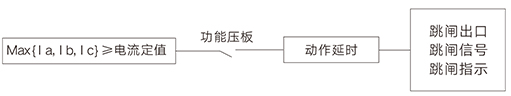 当三相电流中任意一相电流超过整定值并达到相应整定延时后保护动作(可动作于告警或者跳闸),并记录相应的事件信息。相应保护逻辑如 下图所示。
